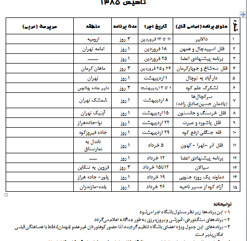 جدول برنامه های سه ماهه بهار 1402 باشگاه کوهنوردی و سنگنوردی اسپیلت