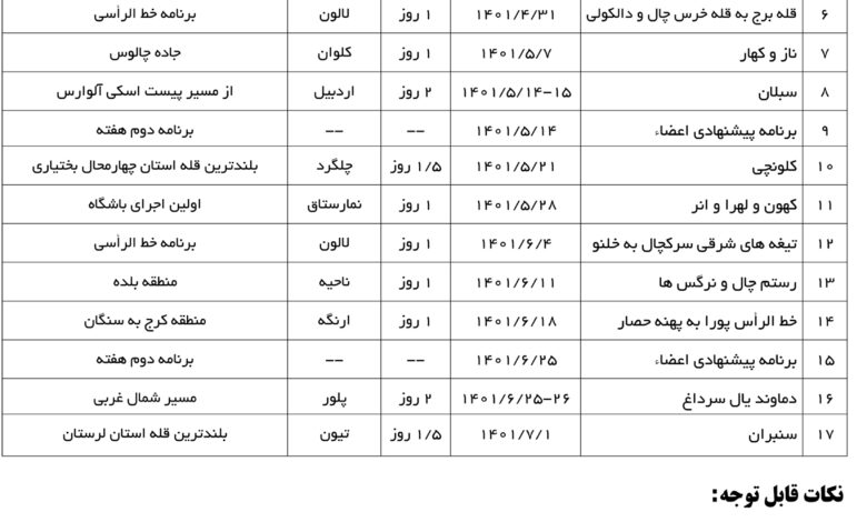 جدول برنامه های سه ماهه تابستان ۱۴۰۱ باشگاه کوهنوردی و سنگنوردی اسپیلت