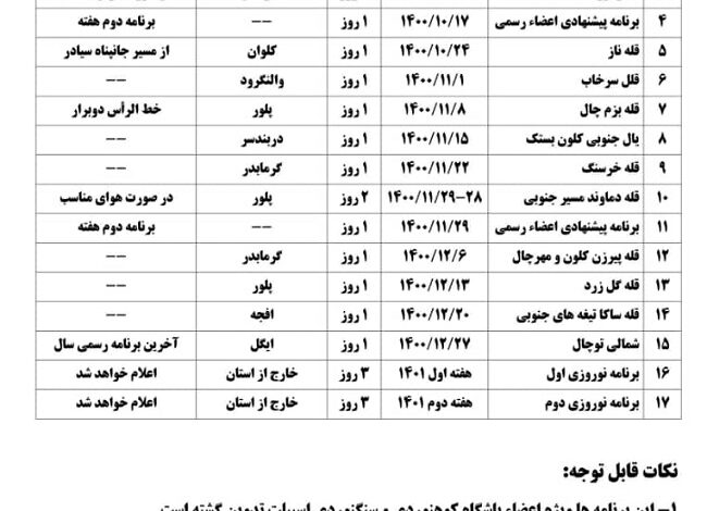 جدول برنامه های سه ماهه زمستان ۱۴۰۰ باشگاه کوهنوردی و سنگنوردی اسپیلت