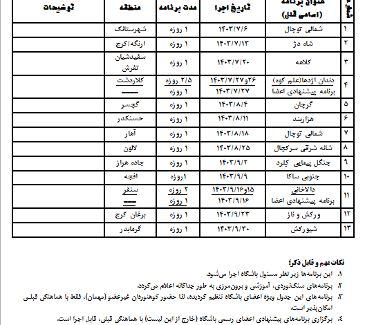 جدول برنامه های سه ماهه پاییز 1403 باشگاه کوهنوردی و سنگنوزدی اسپیلت