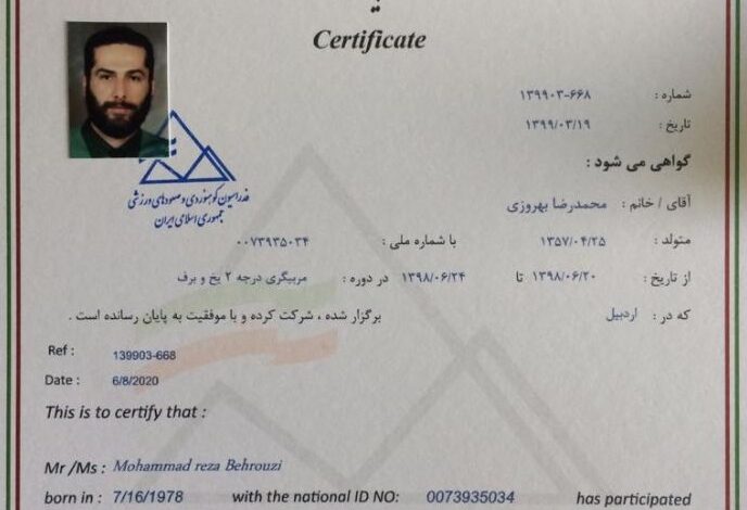 موفقیت محمدرضا بهروزی در اخذ گواهینامه درجه دو یخ و برف