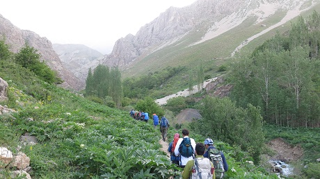 چند سال پیش برای عبور از این رودخانه مجبور بودیم برای جلوگیری از خیس شدن کفشهایمان را دربیاوریم. اما در این برنامه بر روی رودخانه پلی کوچک به طور موقت گذاشته بودند. عبور از رودخانه به سهولت انجام شد و بعد از یکساعت و نیم کوهپیمایی به چشمه تلخآب رسیدیم و در آنجا صبحانه را میل کردیم. هوایی صاف و آفتابی در منطقه حاکم بود. بعد از خوردن صبحانه به مسیرمان ادامه دادیم و ساعت ۹:۳۰ به آبشار خلنو رسیدیم. آبشار آخرین نقطهای بود که به آب آشامیدنی دسترسی داشتیم به همین دلیل به اندازه کافی برای صعود و فرود آب برداشتیم.