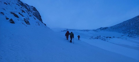 روز بعد ساعت ۳ صبح بیدار شده با بررسی هوا که همچنان باد شدید و سردی داشت اما بارش آن قطع شده بود تصمیم به صعود قله گرفتیم.